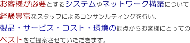 現在、各企業ではネットビジネス参入や社内基幹業務に関して、その経営や運営の効果を図ることが重要課題になっております。 弊社では、クライアントのご要望、ご予算を考慮しながら最も適したシステムを必要最小限から導入し、さらにサーバ・ネットワークシステム及び業務拡大にともない第2段階、第3段階へとステップアップする方法で構築してまいります。
